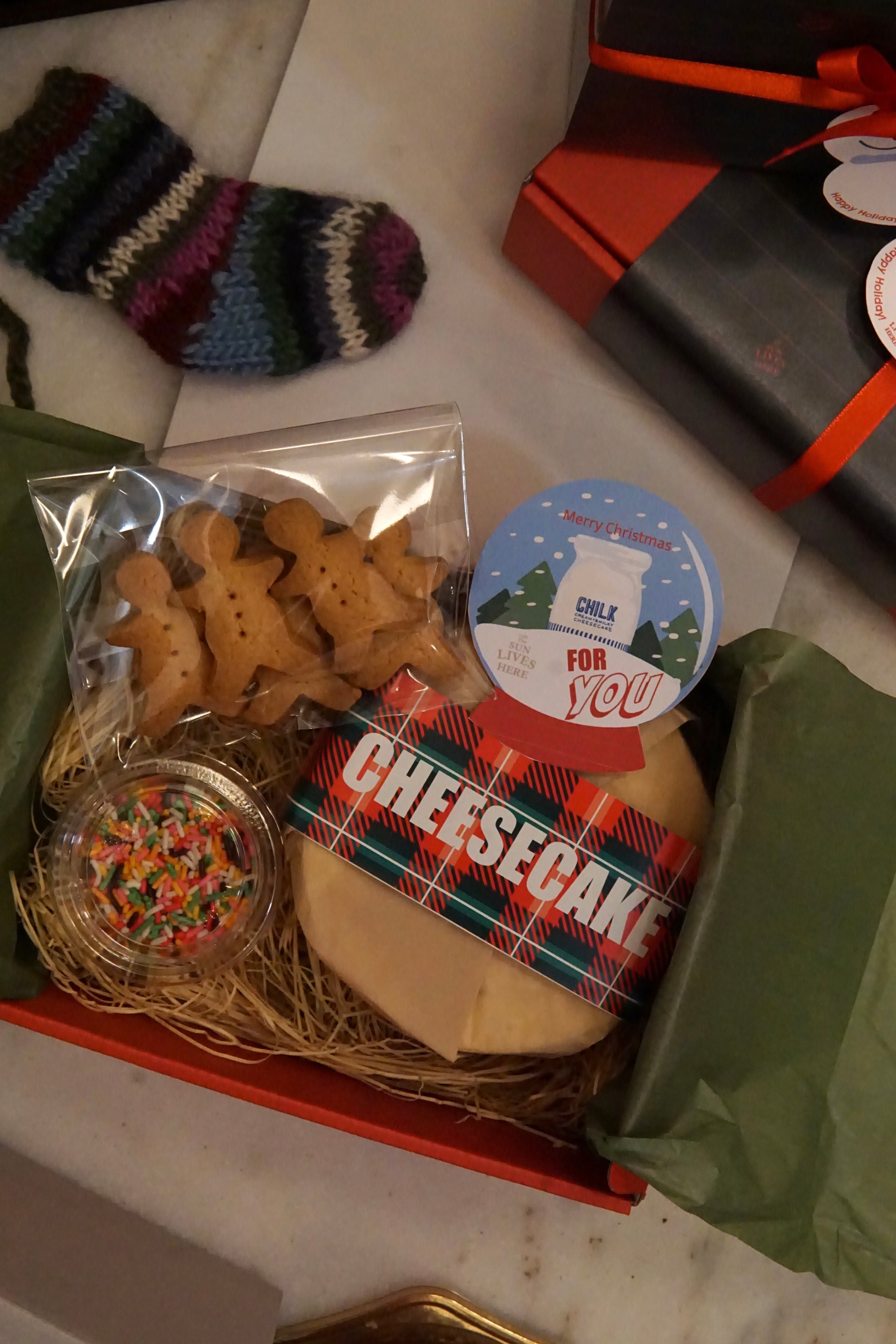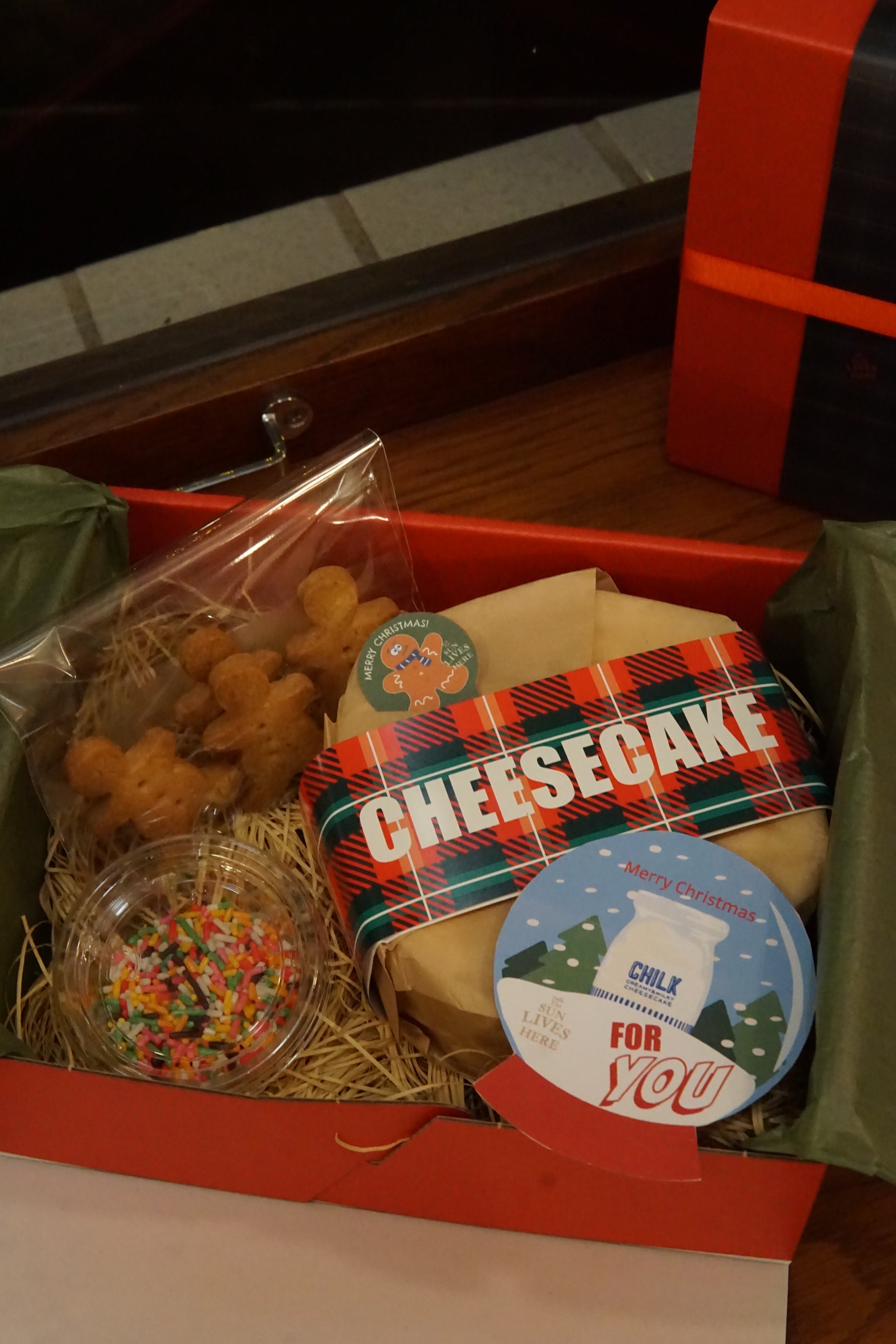 12㎝サイズホールケーキ(チョコレートのNYチーズケーキ / 生クリームチーズケーキ) / ジンジャーマンクッキー(5枚)/ カラフルチョコスプレー / クリスマスラッピング / リボン / 保冷剤 / スプーン4本 /